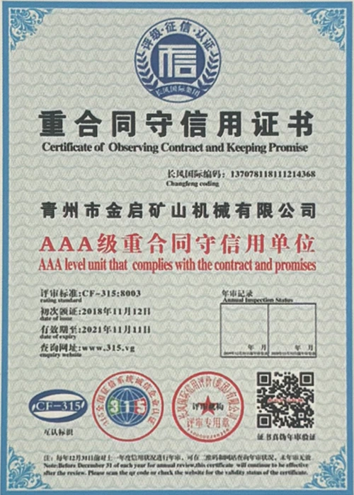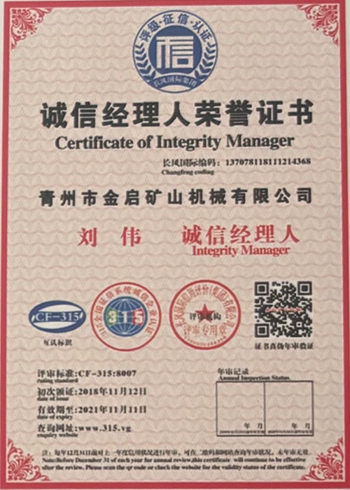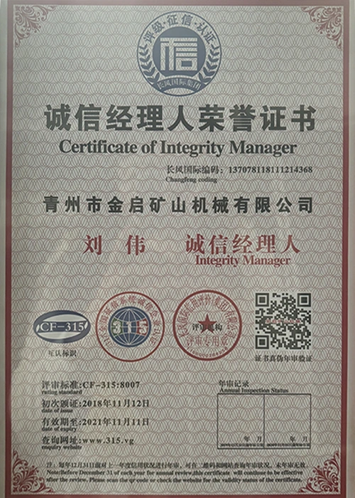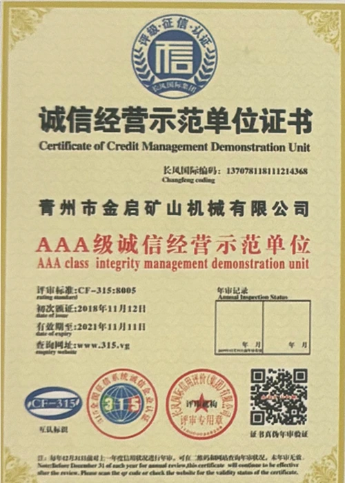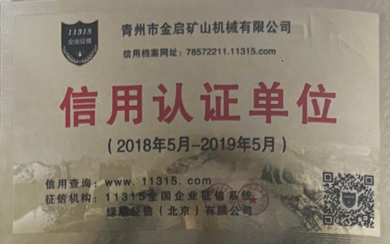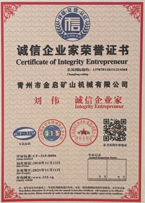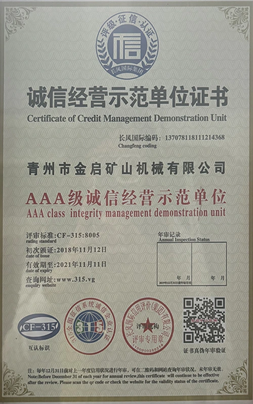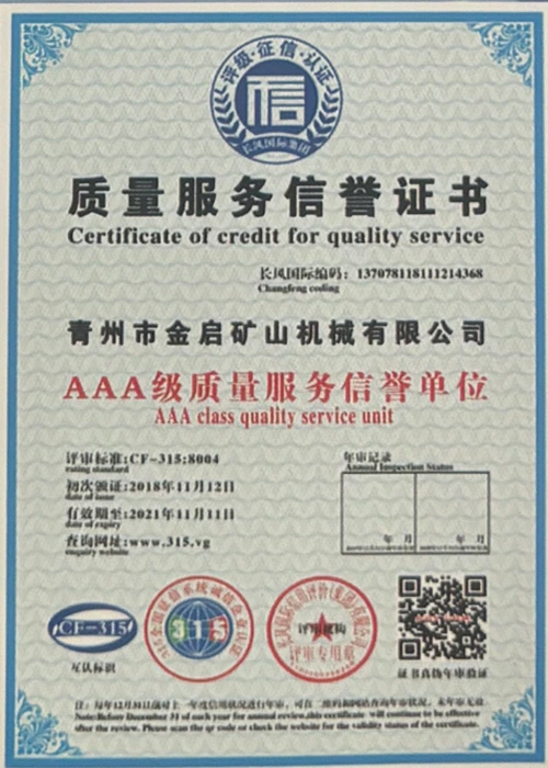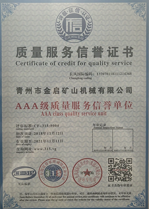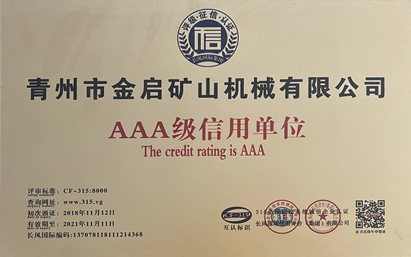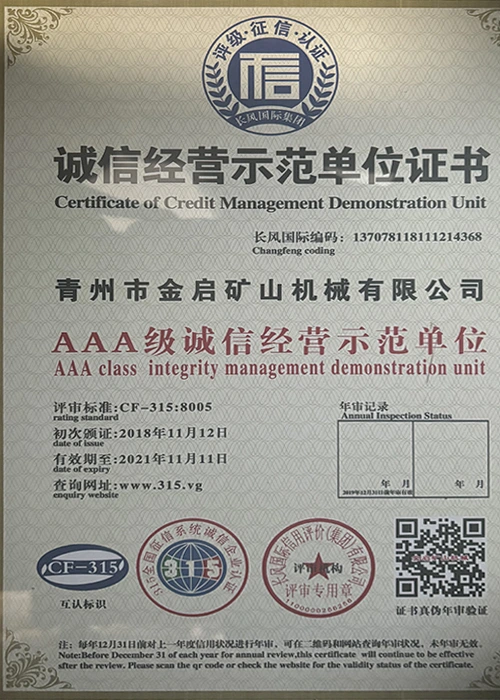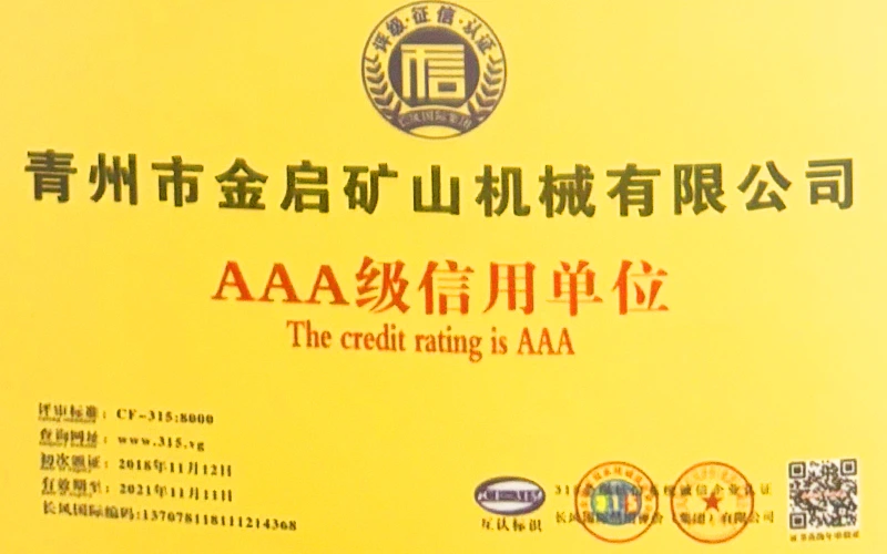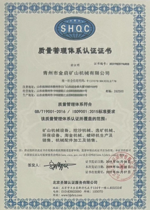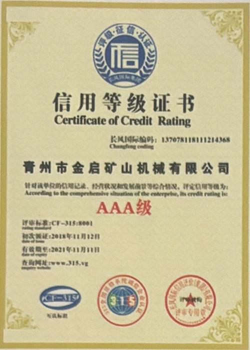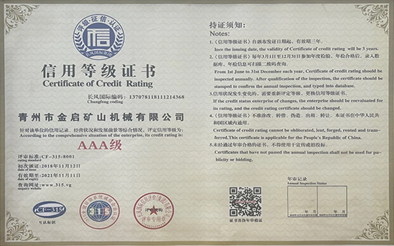 Με πολυετή εις βάθος εμπειρία στον κλάδο, βασιζόμενη στον αυστηρό ποιοτικό έλεγχο και τη συνεχή τεχνολογική καινοτομία, η εταιρεία έχει αποκτήσει μια σειρά από έγκυρα προσόντα, πιστοποιήσεις και πιστοποιητικά διπλωμάτων ευρεσιτεχνίας, όπως πιστοποίηση συστήματος διαχείρισης ποιότητας ISO, πιστοποίηση ασφάλειας προϊόντων εξόρυξης, καθώς και πολλαπλές ευρεσιτεχνίες εφευρέσεων και ευρεσιτεχνίες μοντέλων χρησιμότητας. εγγύηση παραγωγής.